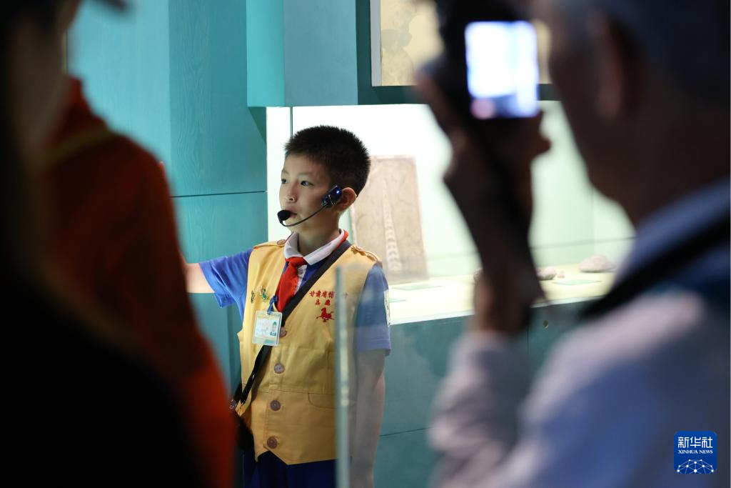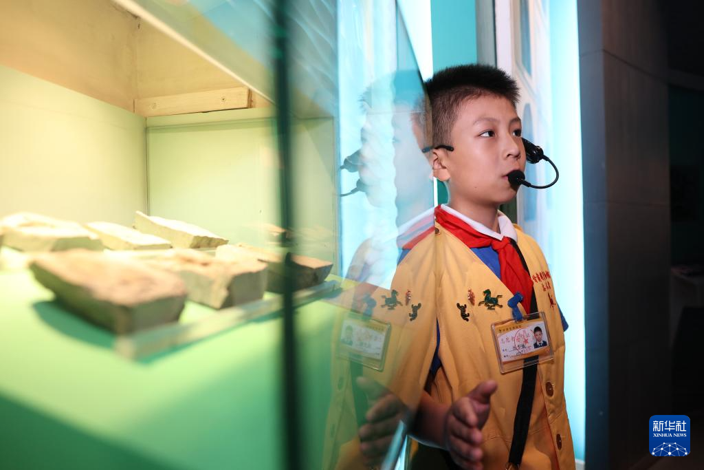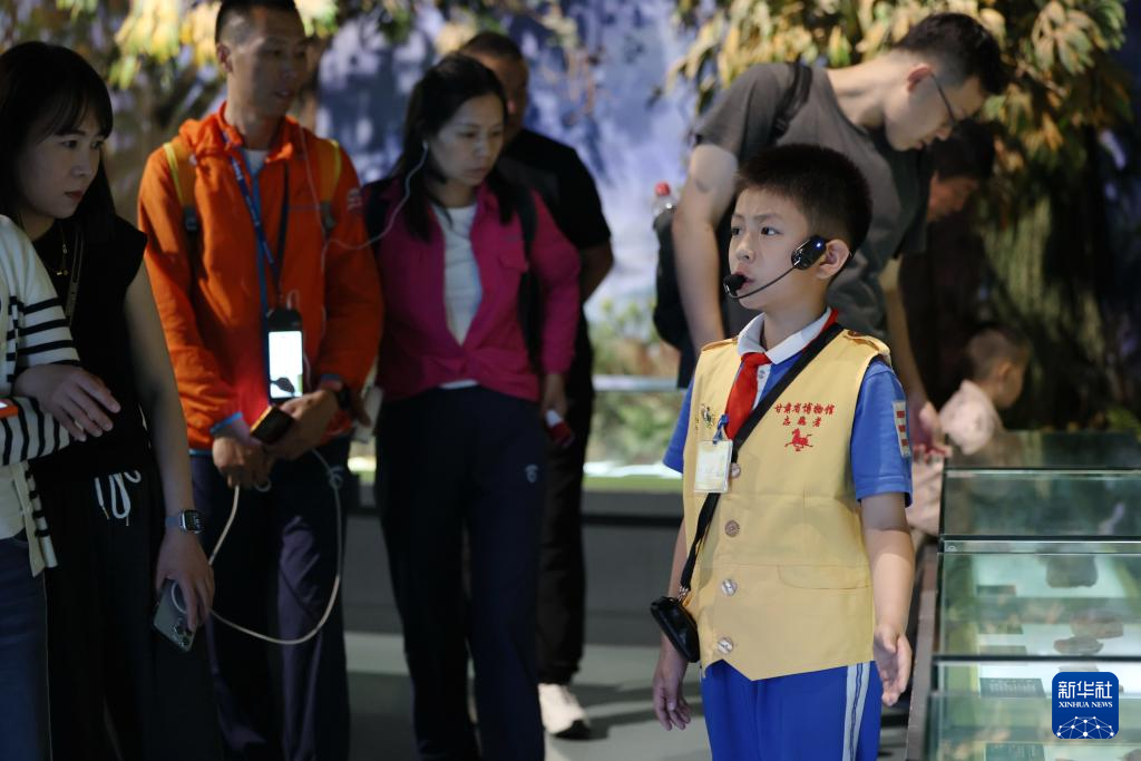 身穿黄色志愿者小马甲,佩戴好扩音器,今年9岁的甘肃省博物馆讲解员张书铖从容走进展厅。他字正腔圆的讲解和落落大方的谈吐吸引了不少游客驻足赞叹。