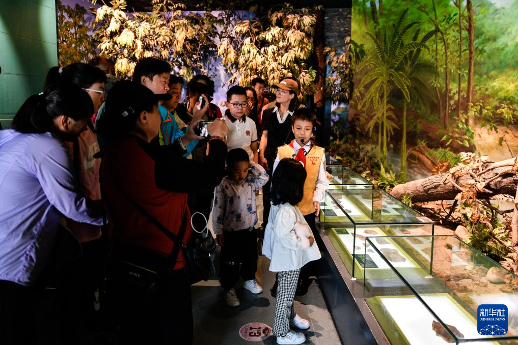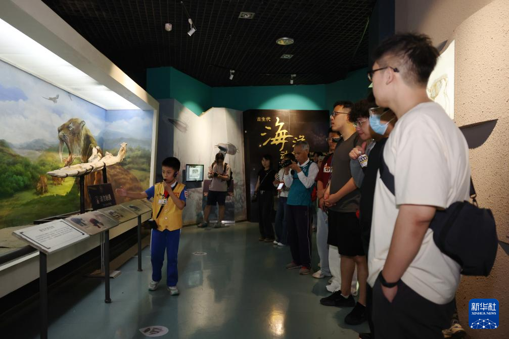 张书铖在甘肃省博物馆古生物化石展厅为游客讲解(5月12日摄)。