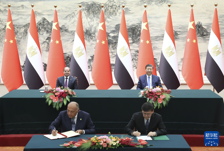 5月29日下午,国家主席习近平在北京人民大会堂同来华出席中国-阿拉伯国家合作论坛第十届部长级会议开幕式并进行国事访问的埃及总统塞西举行会谈。这是会谈后,两国元首共同见证签署多项双边合作文件。