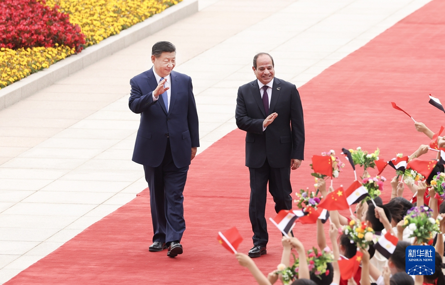 5月29日下午,国家主席习近平在北京人民大会堂同来华出席中国-阿拉伯国家合作论坛第十届部长级会议开幕式并进行国事访问的埃及总统塞西举行会谈。这是会谈前,习近平在人民大会堂东门外广场为塞西举行欢迎仪式。