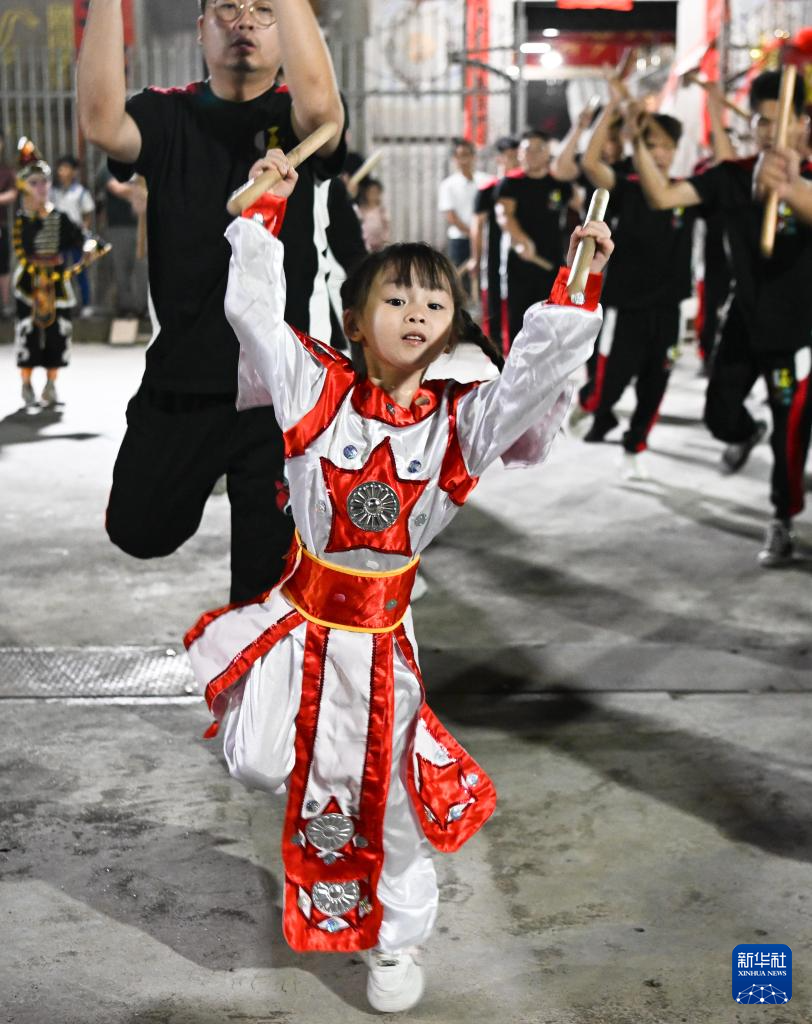 5月29日,在汕头市贵屿镇玉窖村的英歌队排练现场,庄恩琪与玉和兴英歌队队员一起跳英歌舞。 新华社记者 邓华 摄pagebreak