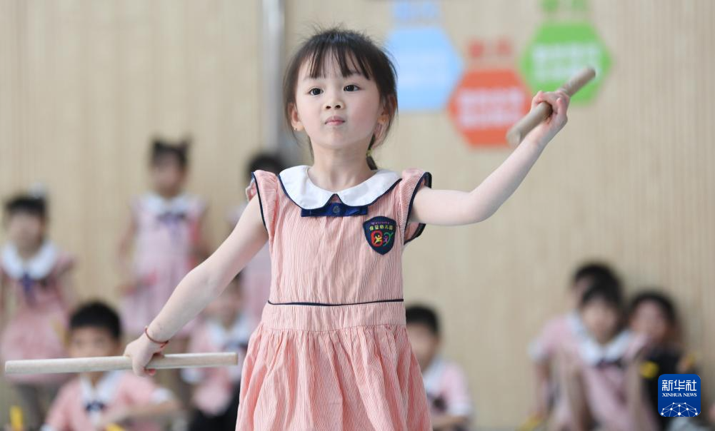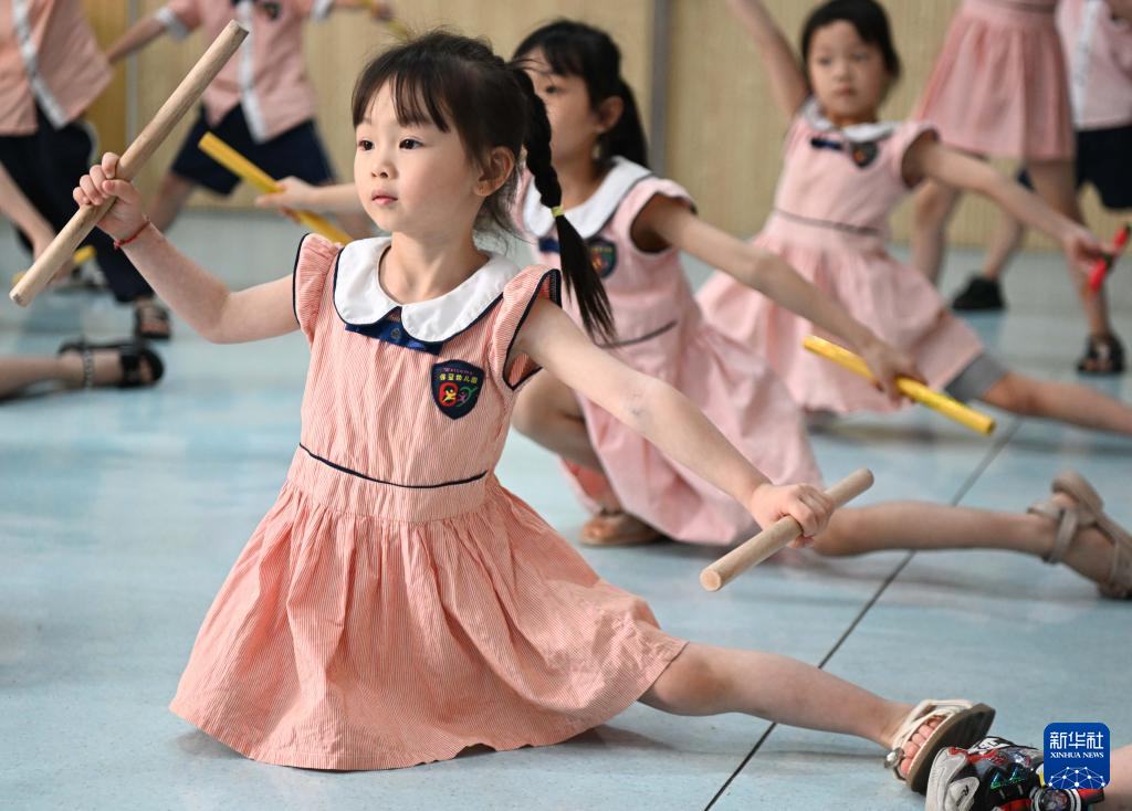 5月29日,在汕头市贵屿镇北林保婴幼儿园,庄恩琪练习跳英歌舞。 新华社记者 邓华 摄pagebreak