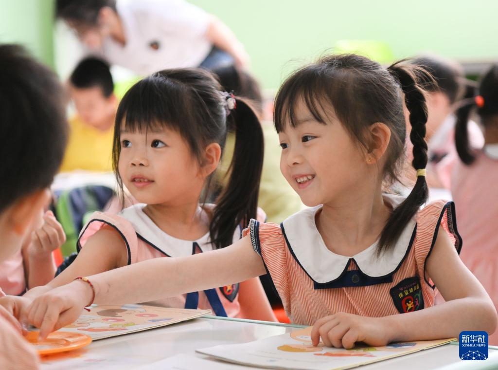 5月29日,在汕头市贵屿镇北林保婴幼儿园,庄恩琪(右)和同学在课堂上。 新华社记者 邓华 摄pagebreak