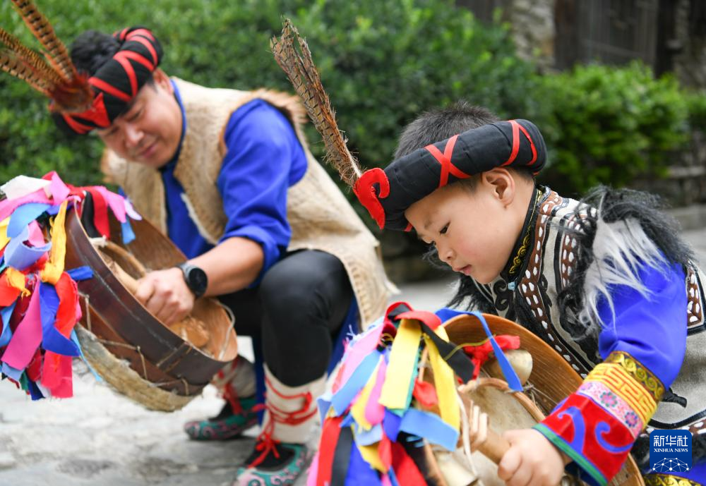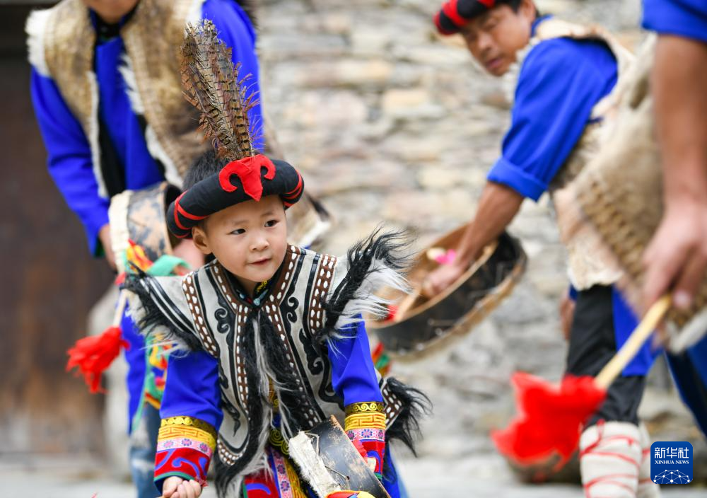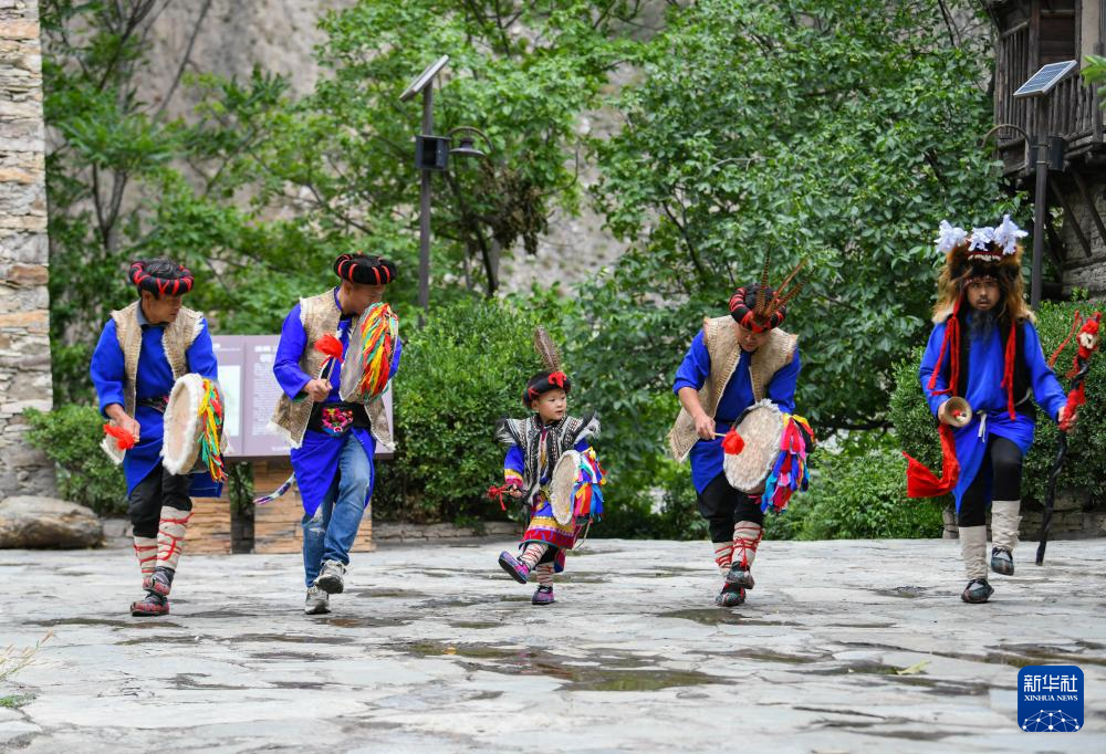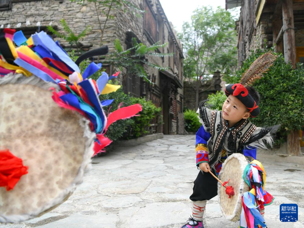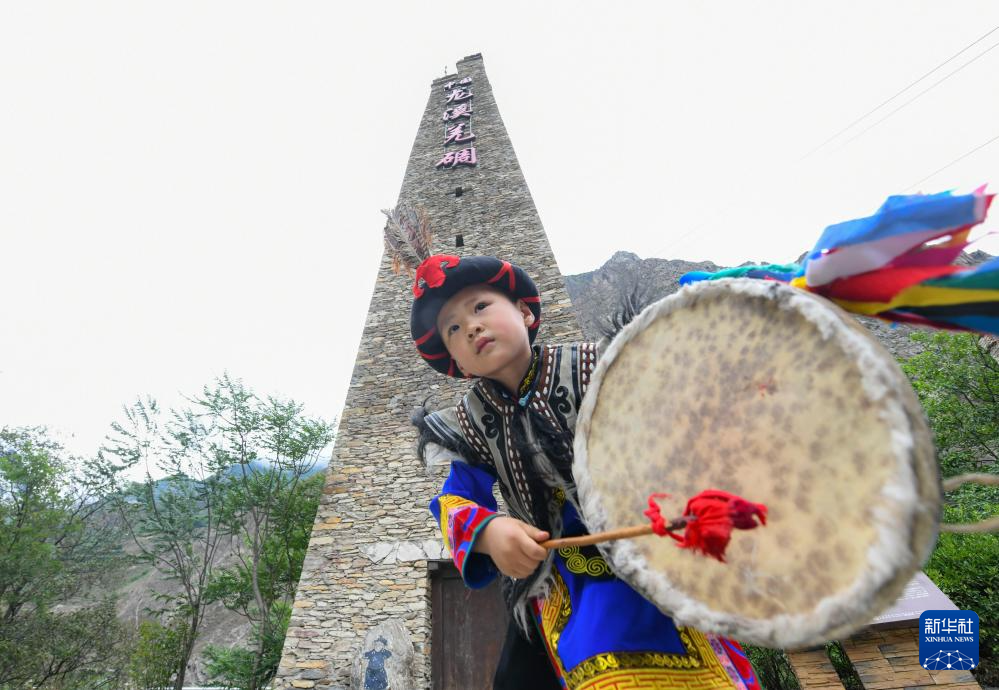 “嘣嘣嘣,嘣……”在四川省阿坝藏族羌族自治州汶川县,羌山河谷中传来一阵密集的鼓声。站在寨子里的碉楼下,左手持鼓,右手执槌,拍鼓、甩脚、旋转、吆喝……3岁萌娃小耶格有模有样地和他的长辈们跳起羊皮鼓舞。