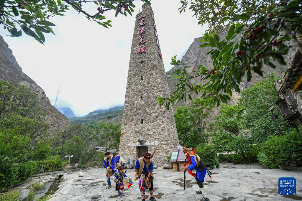 5月29日,在汶川县灞州镇联合村,小耶格和长辈们在村里的碉楼下跳羊皮鼓舞。
