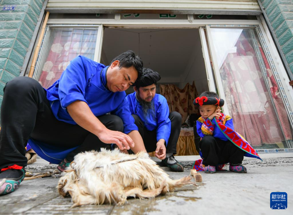 5月29日,在汶川县灞州镇联合村,小耶格和舅爷赵俊成为练习羊皮鼓舞做准备。