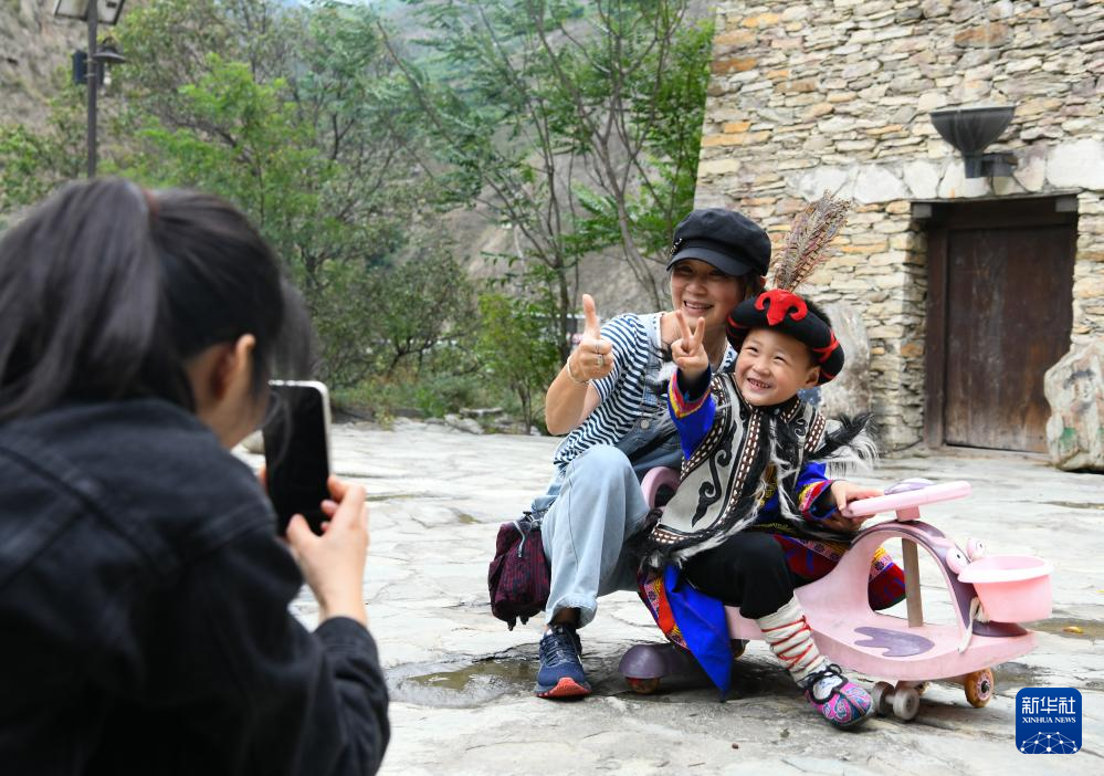 5月29日,在汶川县灞州镇联合村,游客和小耶格合影留念。