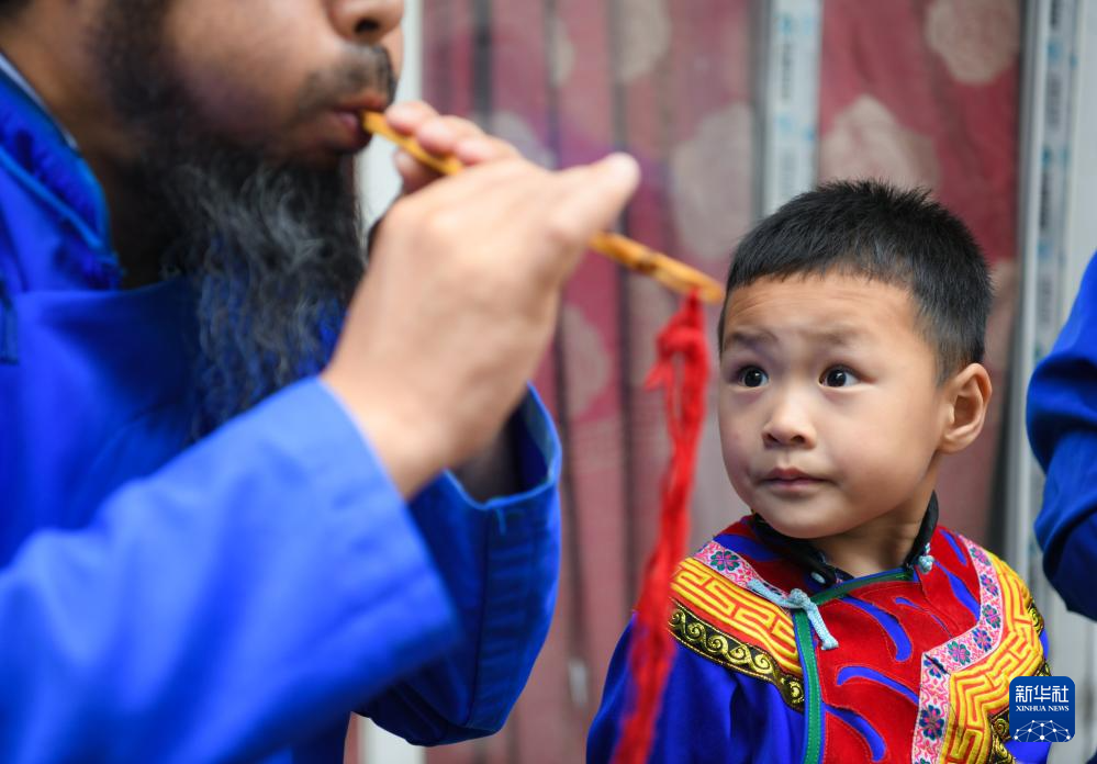 在小耶格的家族,羊皮鼓舞和羊皮鼓制作技艺已经传承了好几代,小耶格从小耳濡目染。8个月大的时候,小耶格就拿起鼓槌当玩具敲着玩。现在,拿起专门为他制作的小羊皮鼓,小耶格已经能够很自信地跟着长辈们的节奏跳起来。