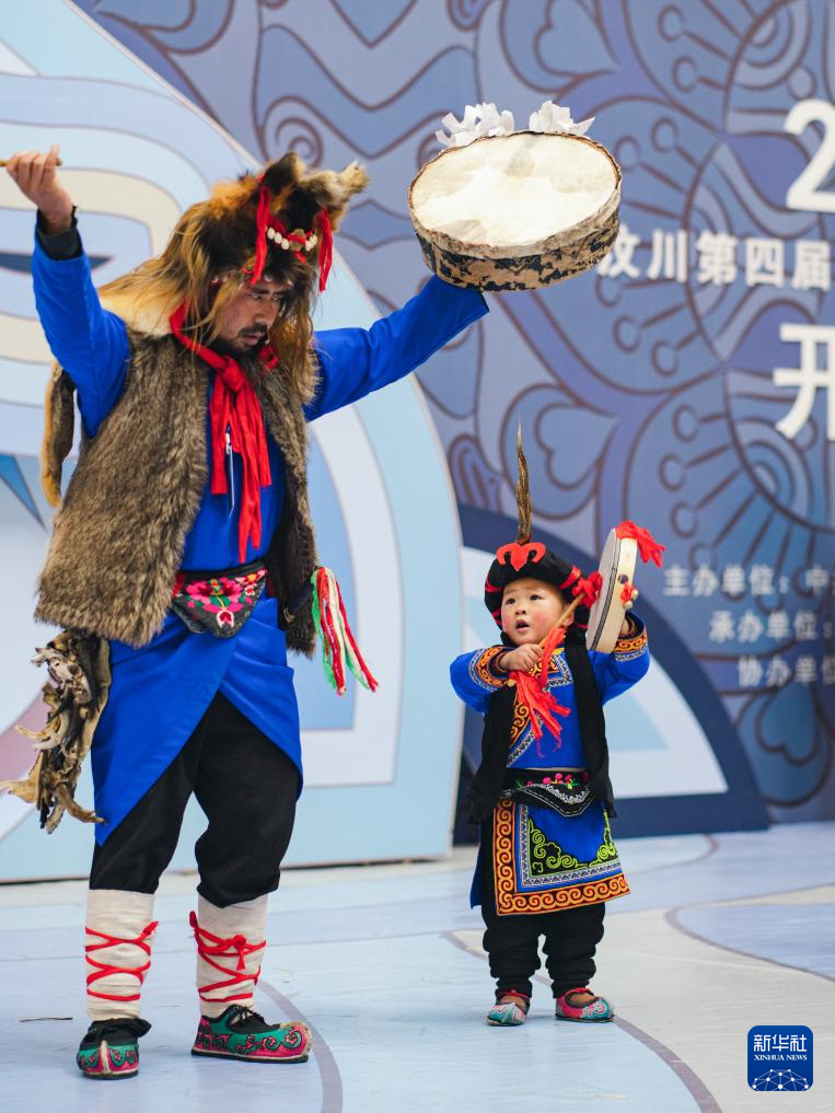 在汶川县第四届羌族传统体育运动会上,小耶格和舅爷赵俊成表演羊皮鼓舞(2023年2月16日摄)。