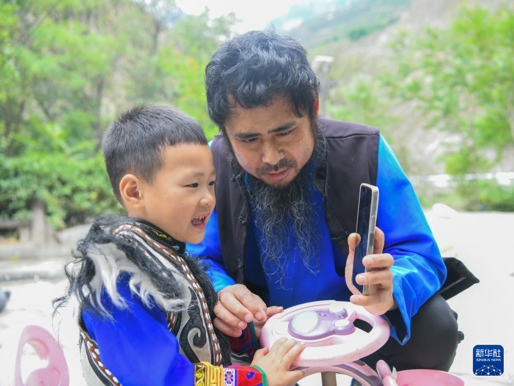5月29日,在汶川县灞州镇联合村,舅爷赵俊成给小耶格看用手机录制的羊皮鼓舞视频。