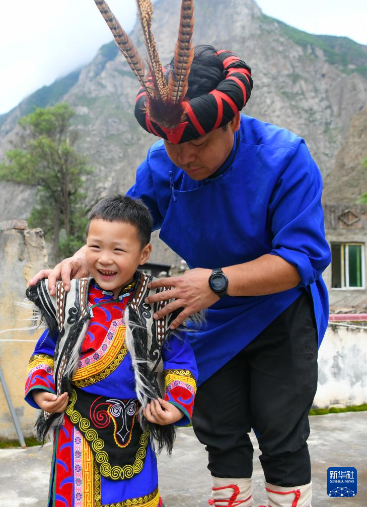 5月29日,在汶川县灞州镇联合村,舅爷赵晓成为小耶格换上羌服和羊皮褂。