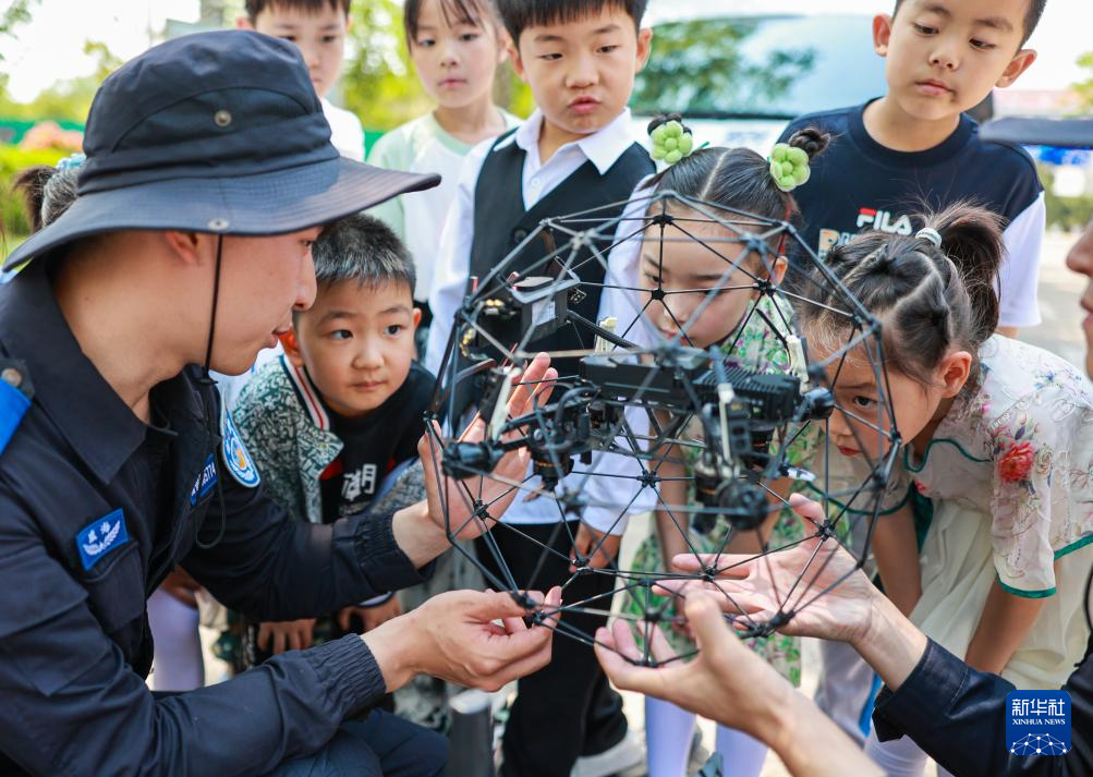 5月31日,在山东省荣成市府新小学,特警队员为孩子们演示警用无人机的操控流程。