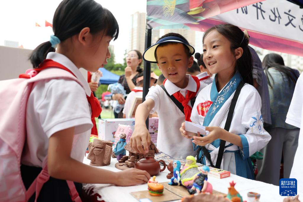 5月31日,甘肃省兰州市东郊学校的小学生在创意义卖市集上给同学介绍兰州特色民俗文化。