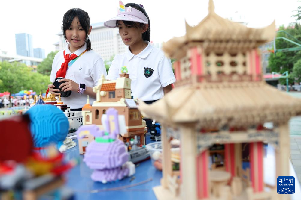 5月31日,甘肃省兰州市东郊学校的小学生在创意作品展示区参观手工制作作品。