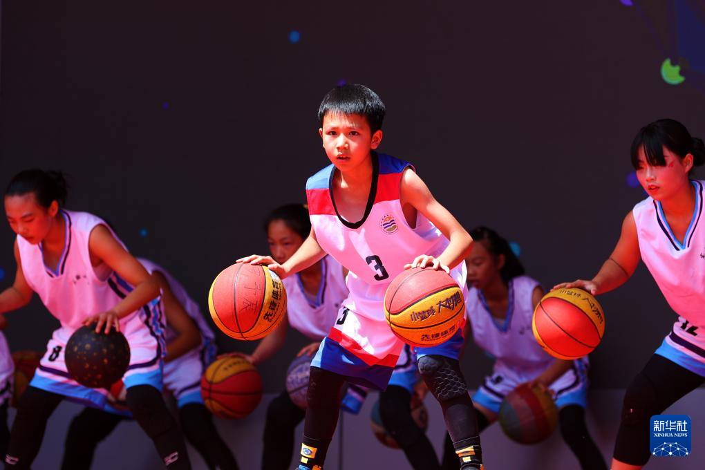 5月31日,重庆市黔江区实验小学学生表演“快乐篮球操”。