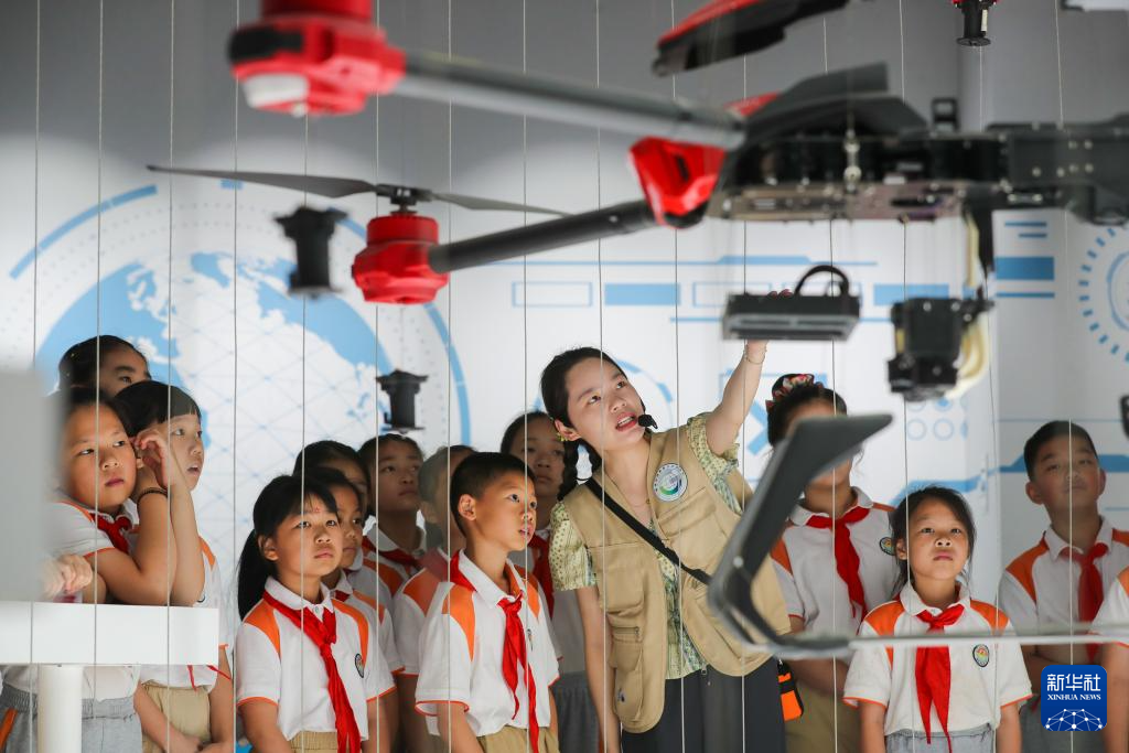 5月31日,浙江省湖州市德清县地理信息科技馆的工作人员为春晖小学的学生讲解航天科技知识。
