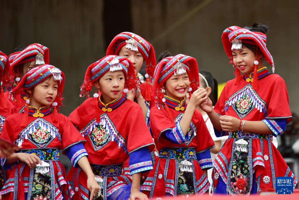 5月31日,在广西贺州市八步龙山小学,身穿民族服饰的学生准备登台表演节目。