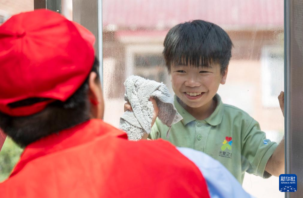 5月31日,中建三局二公司北京公司工会“水滴”志愿者们来到专门救助来自全国各地困境儿童的全免费寄宿制学校——北京光爱学校,与这里的孩子们一起开展联谊活动。一名小学生(右)和志愿者一同在校园内清理环境卫生。