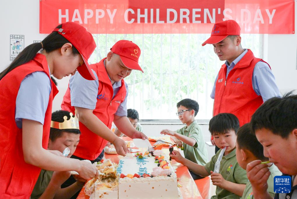 5月31日,中建三局二公司北京公司工会“水滴”志愿者们来到专门救助来自全国各地困境儿童的全免费寄宿制学校——北京光爱学校,与这里的孩子们一起开展联谊活动。这是志愿者们在学校餐厅为学生们切分蛋糕。