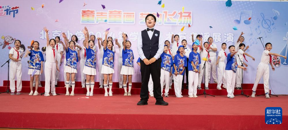 5月31日,北京市北京小学六年级学生在学校举行的“童声童画 艺韵飞扬”艺术节童谣展演活动中表演节目。