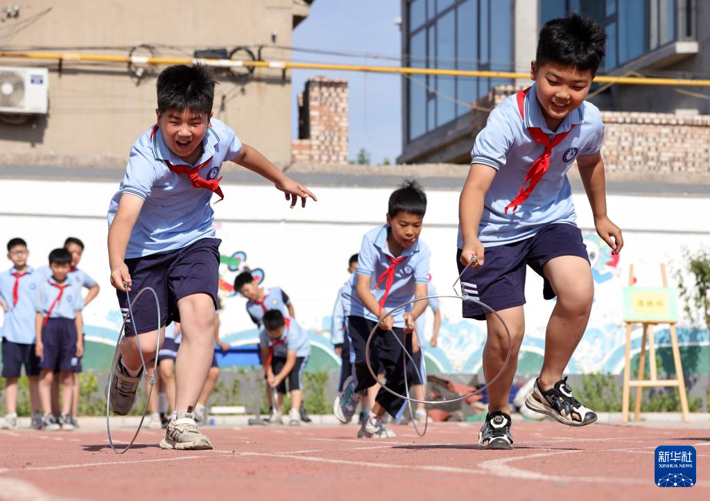 5月31日,河北省邢台市广宗县第六小学学生在玩滚铁环游戏。