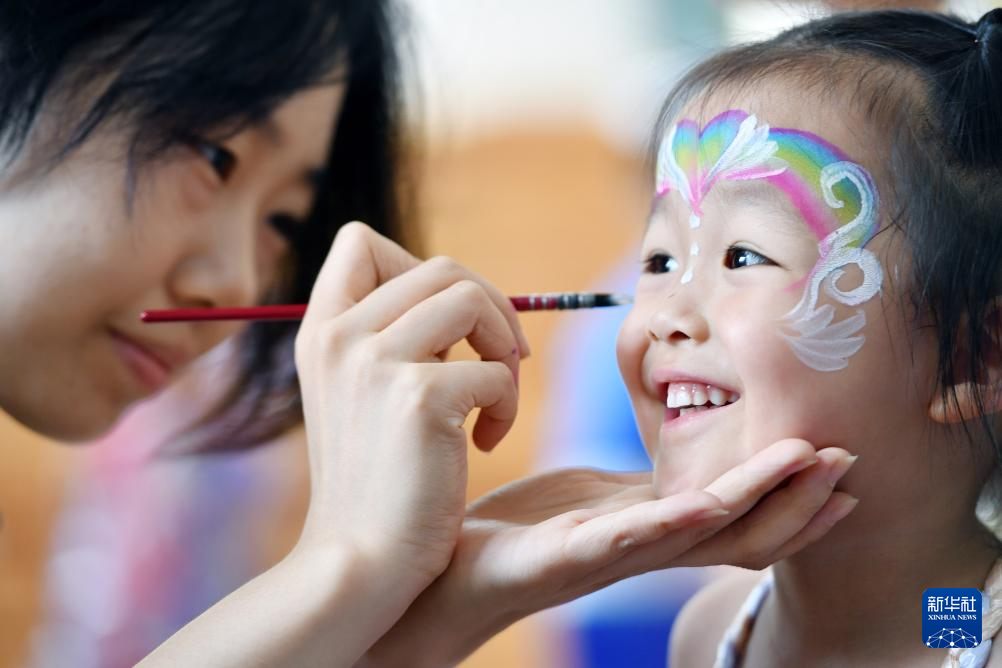 5月31日,位于武汉市洪山区的华中师范大学幼儿园组织亲子游园会、爱心义卖、画展等活动。这是小朋友在活动现场体验面部彩绘。