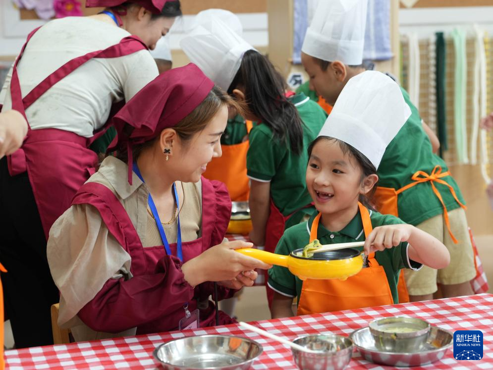 5月31日,在河北省石家庄市第三实验幼儿园,小朋友和家长制作美食。