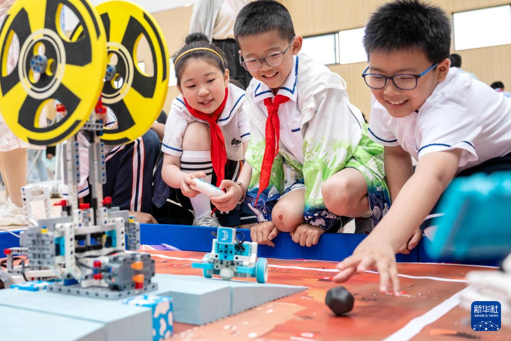 5月31日,浙江省湖州市长兴县实验小学龙山校区学生在科普游园会现场体验科创项目。