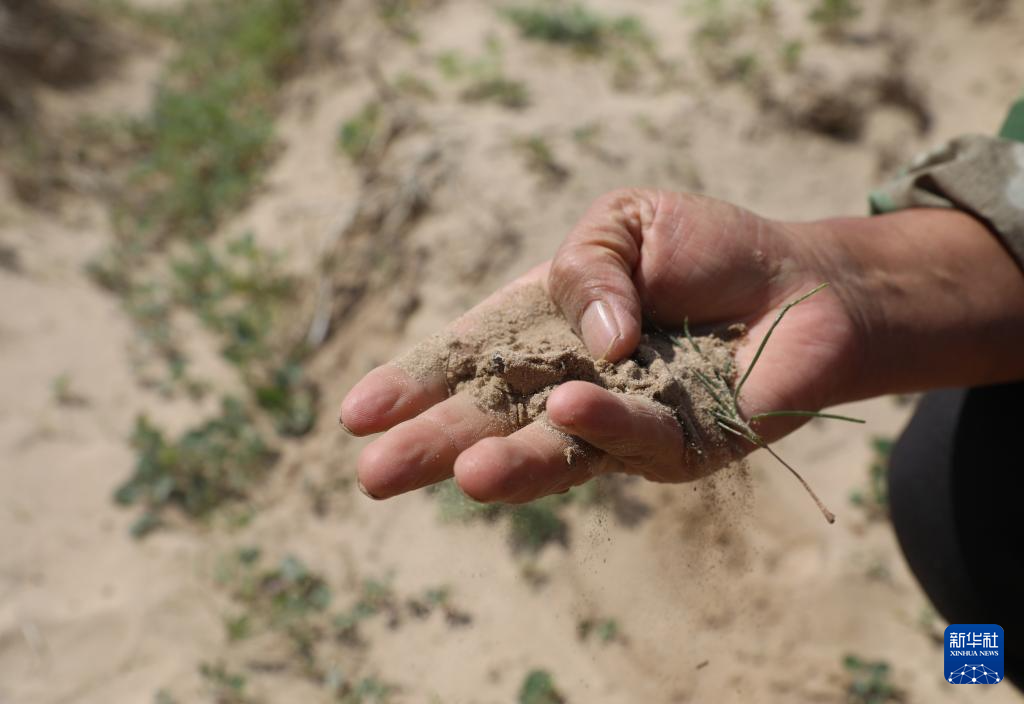 5月31日,李东魁查看沙地里野草生长情况。新华社记者 杨青摄pagebreak