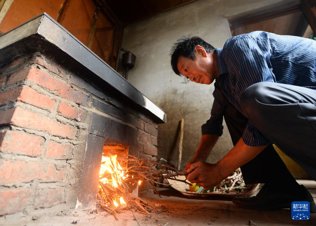 李东魁在家中生火做饭(2013年8月3日摄)。新华社记者 杨青摄pagebreak