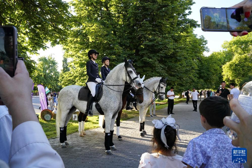 6月1日,在乌兹别克斯坦首都塔什干,小朋友观看为庆祝儿童节举办的骑兵阅兵式。