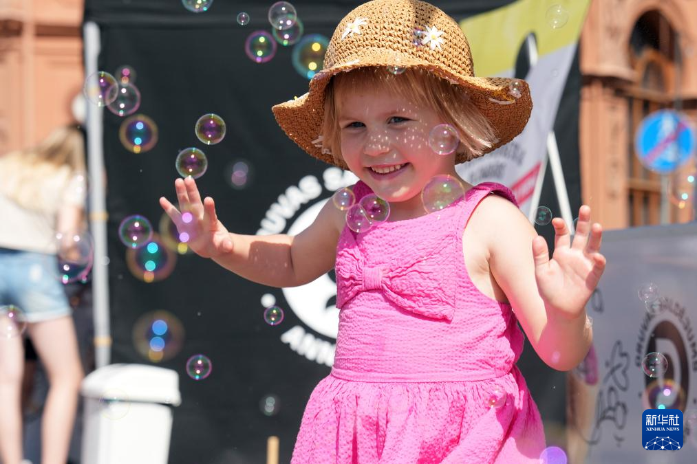 6月1日,在拉脱维亚首都里加的圆顶广场,一名女孩在儿童节活动上玩肥皂泡泡。