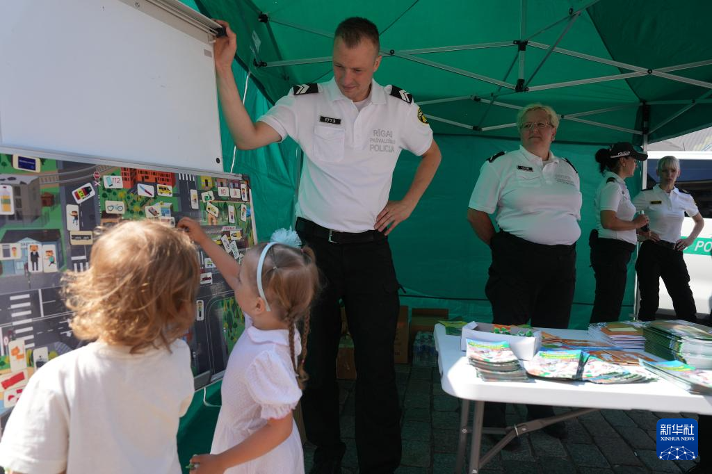 6月1日,在拉脱维亚首都里加的圆顶广场,小朋友在警察站参加儿童节活动。