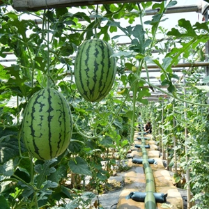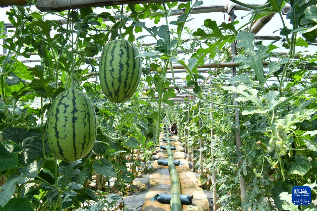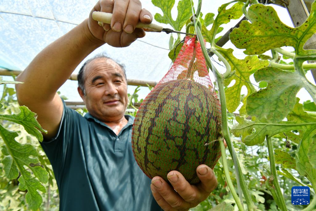 6月3日,农民在河北省盐山县盐山镇一处果蔬种植棚内收获西瓜。