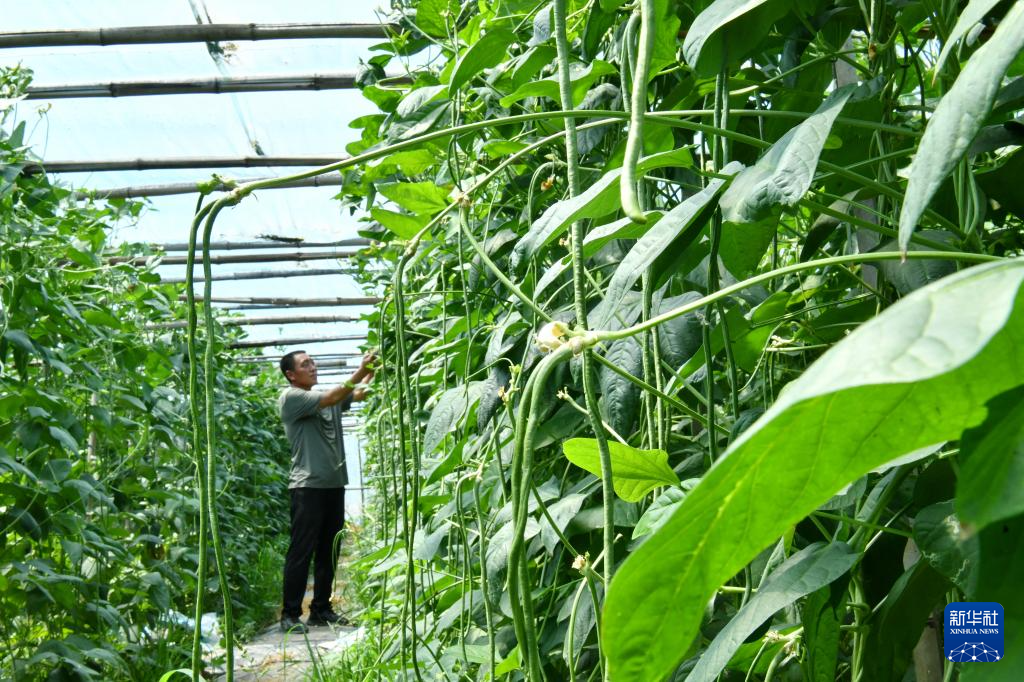 6月3日,农民在河北省盐山县盐山镇一处果蔬种植棚内打理种植的豆角。
