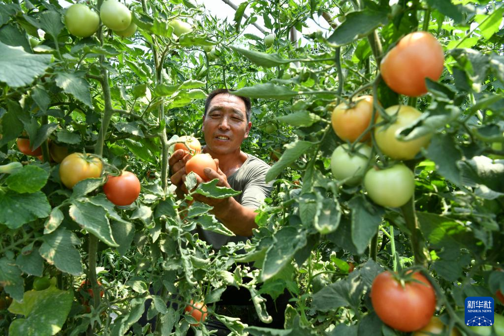 6月3日,农民在河北省盐山县盐山镇一处果蔬种植棚内采摘西红柿。