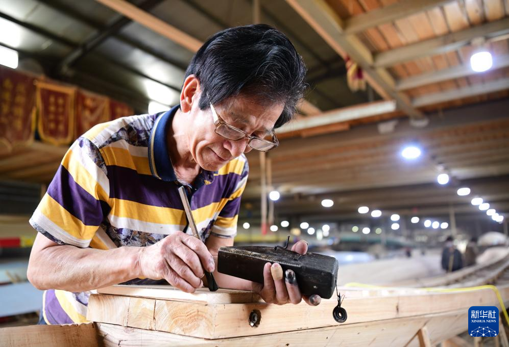 6月3日,在“龙舟世家”方忠雄龙舟厂,龙舟制造师傅在使用墨斗给龙舟打样。