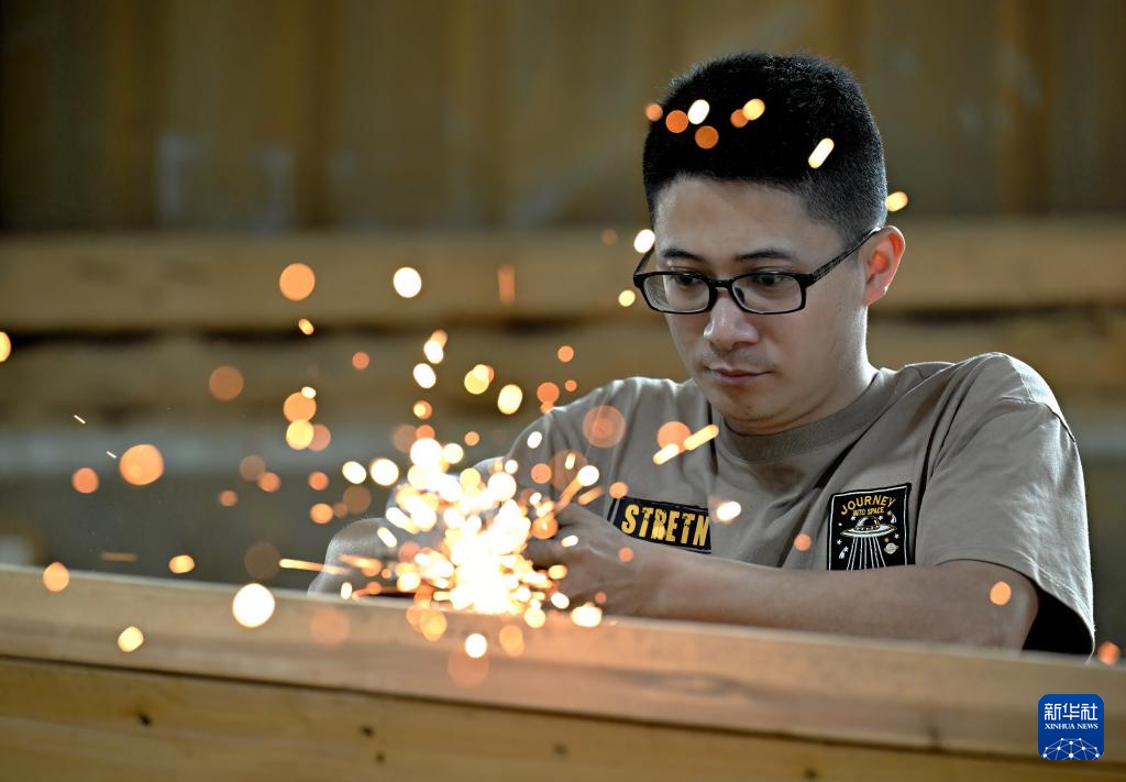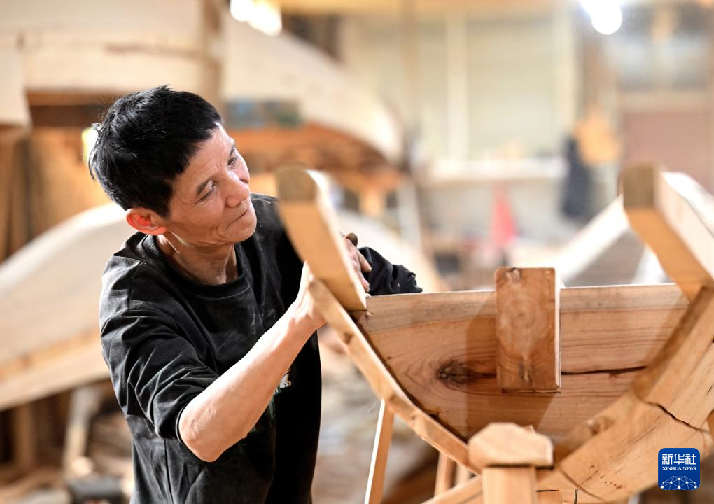 6月3日,“方庄龙舟制造技艺(闽侯县)”第四代传承人方剑伟在加工龙舟。
