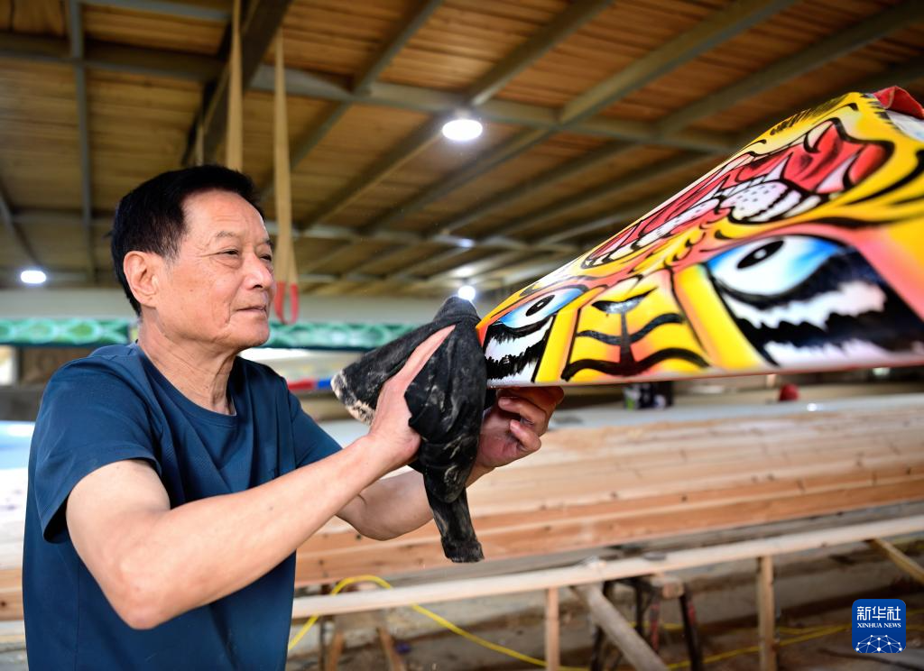 6月3日,福州市非物质文化遗产“方庄龙舟制造技艺(闽侯县)”的传承人方绍晃在擦拭准备交付的龙舟船头。