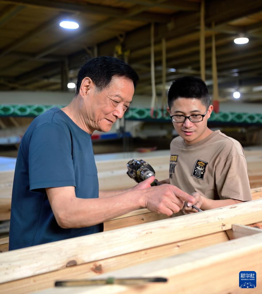 6月3日,福州市非物质文化遗产“方庄龙舟制造技艺(闽侯县)”的传承人方绍晃(左)在给侄儿方剑伟(右)传授福州传统龙舟制作技艺。方剑伟现在是“方庄龙舟制造技艺(闽侯县)”第四代传承人。