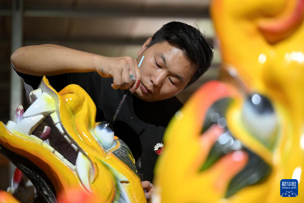 6月3日,工人在给一颗新龙头上色。龙舟龙头的制作最为复杂,需用几十把不同的修光刀进行加工,再进行切割、喷漆、上色等步骤。