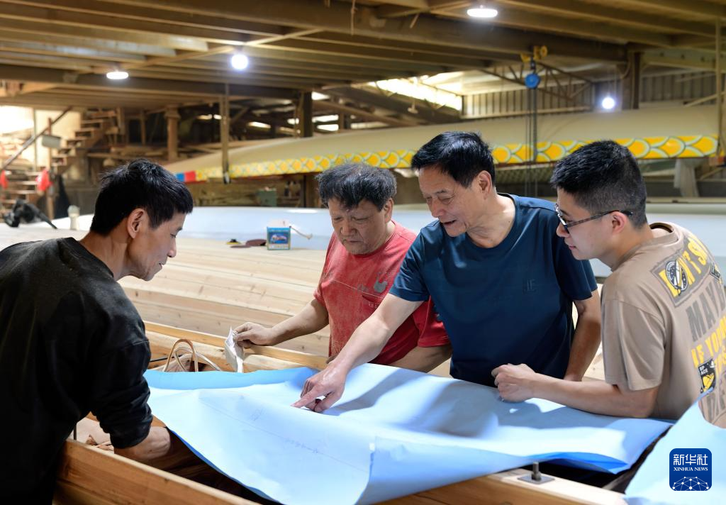 6月3日,福州市非物质文化遗产“方庄龙舟制造技艺(闽侯县)”的传承人方绍晃(右二)与家人们一起探讨龙舟的制作工艺。