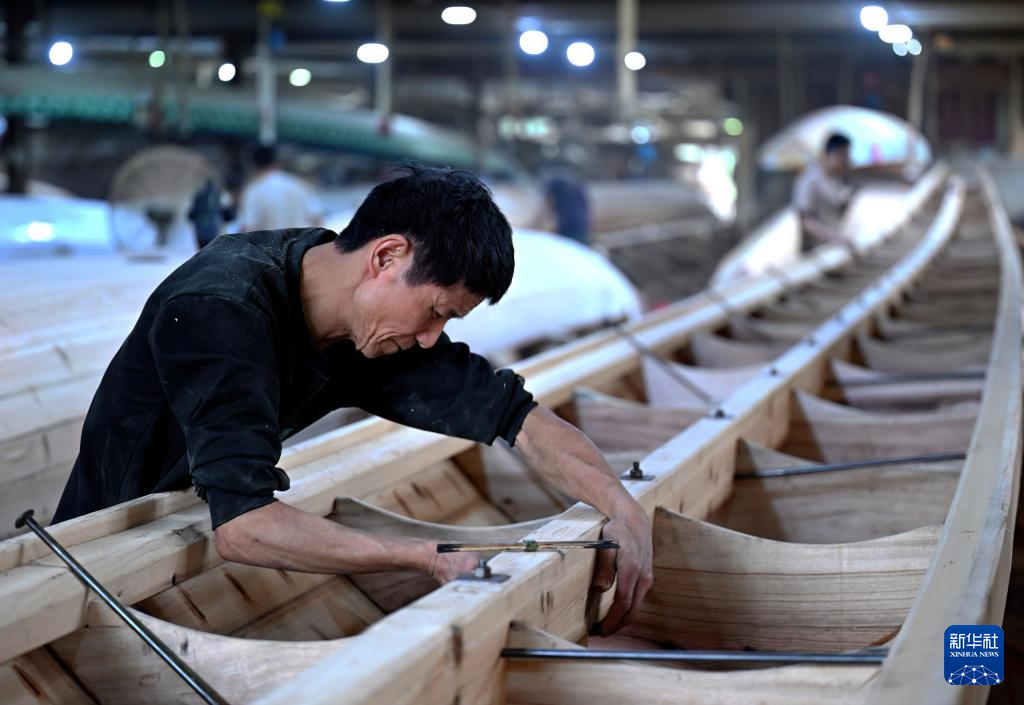6月3日,在闽侯县方庄村的方和勇龙舟厂里,工人在赶制端午节的龙舟订单。