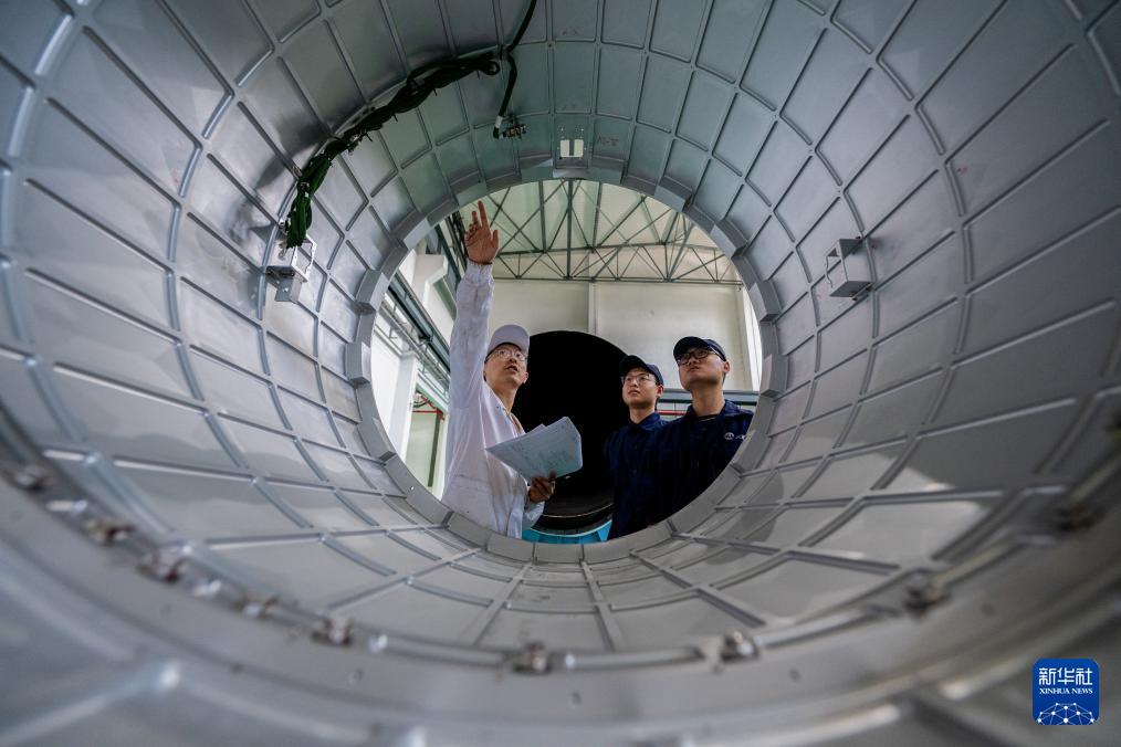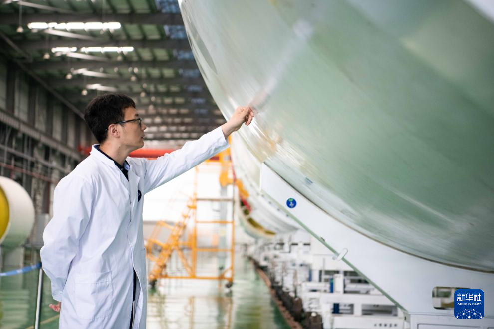 6月3日,在位于安徽池州的安徽星河动力装备科技有限公司内,邢柏强在检查液体火箭整流罩的状态。今年39岁的邢柏强是安徽星河动力装备科技有限公司动力制造部部长,主要负责该公司液体火箭发动机的具体研制、固体火箭的末级装配等工作。他曾7次参与谷神星一号火箭发射,牵头完成谷神星一号火箭轨姿控动力系统批量生产,参与智神星一号液体运载火箭发动机的研制工作。