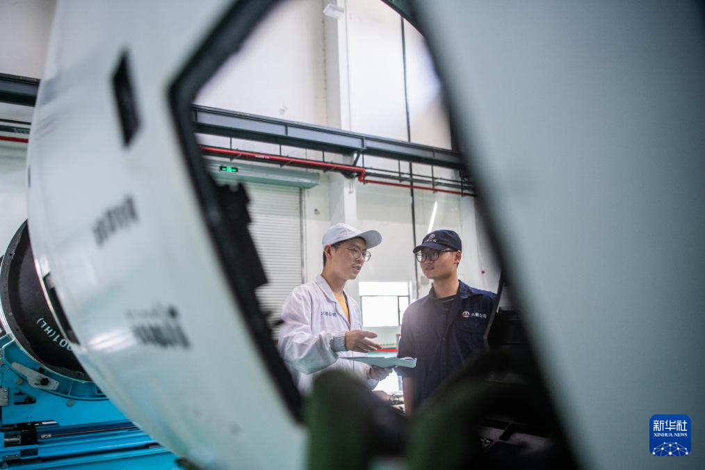 6月3日,航天科工火箭技术有限公司快舟火箭结构设计师刘家欣(左)与装配人员讨论火箭舱段装配要点。今年29岁的刘家欣是航天科工火箭技术有限公司结构与地面设备研究室主任助理、主管设计师,参加过5次快舟火箭履约任务和多项型号设计优化工作,其牵头设计完成的快舟火箭新型复合材料星箭适配器已在多次快舟一号甲火箭发射履约任务中成功应用。