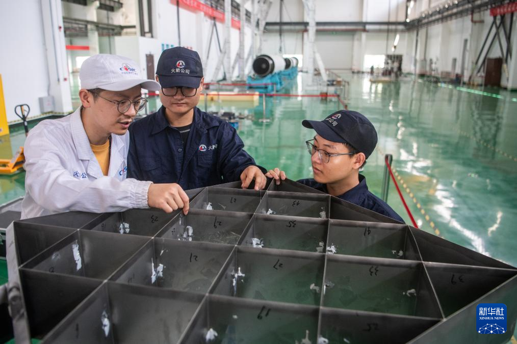 6月3日,航天科工火箭技术有限公司快舟火箭结构设计师刘家欣(左)与装配人员检查栅格舵状态。今年29岁的刘家欣是航天科工火箭技术有限公司结构与地面设备研究室主任助理、主管设计师,参加过5次快舟火箭履约任务和多项型号设计优化工作,其牵头设计完成的快舟火箭新型复合材料星箭适配器已在多次快舟一号甲火箭发射履约任务中成功应用。