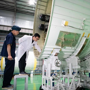 6月3日,航天科工火箭技术有限公司快舟火箭结构设计师刘家欣检查产品内部状态。今年29岁的刘家欣是航天科工火箭技术有限公司结构与地面设备研究室主任助理、主管设计师,参加过5次快舟火箭履约任务和多项型号设计优化工作,其牵头设计完成的快舟火箭新型复合材料星箭适配器已在多次快舟一号甲火箭发射履约任务中成功应用。