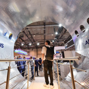 6月5日,在德国舍内费尔德,一名男子在2024柏林国际航空展上的空客公司展区参观。