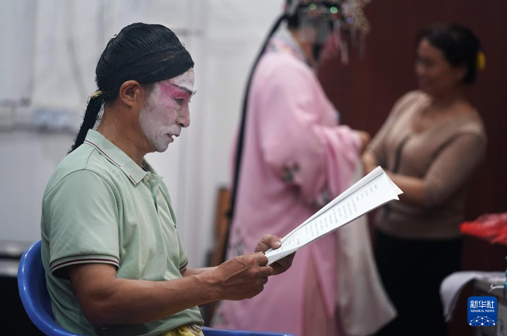 在位于广昌县甘竹镇的大路背孟戏剧团后台,李安平(左一)翻看剧本(5月11日摄)。