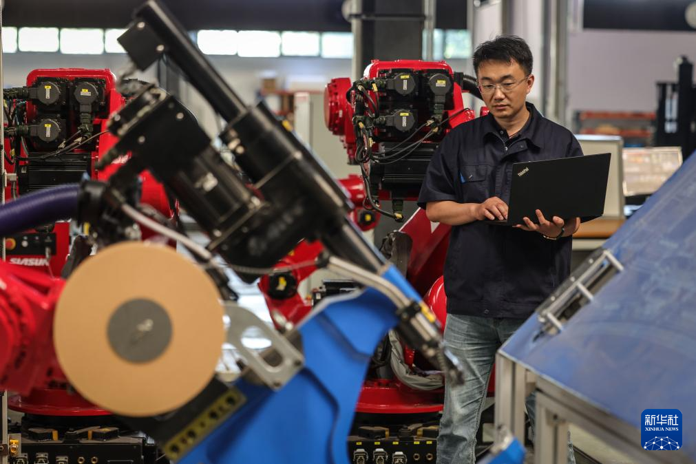 那鹏在调试点焊机器人工艺参数(6月3日摄)。新华社记者 潘昱龙 摄pagebreak